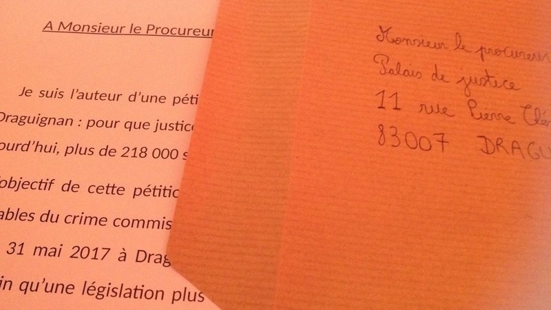 Comme promis, je vous tiens au courant des avancées de mes démarches. J'ai donc adressé une demande de rendez-vous aux autorités concernées, à savoir monsieur le Maire de Draguignan (déposée le 26 juin à l'accueil de la mairie) ainsi que Monsieur le Procureur de la République de Draguignan (le 28 juin par voie postale).