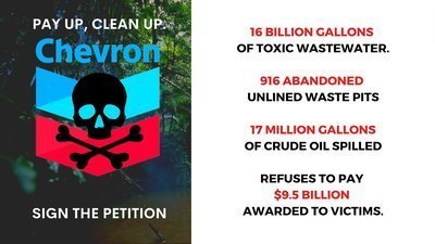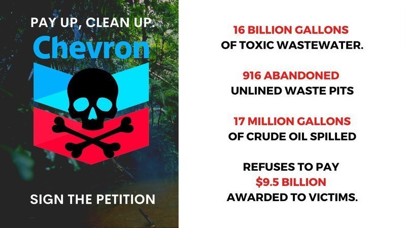 “ Over three decades of oil drilling in the Ecuadorian Amazon, Chevron dumped more than 16 billion gallons of toxic wastewater into the rainforest, leaving local people suffering a wave of cancers, miscarriages, and birth defects. “