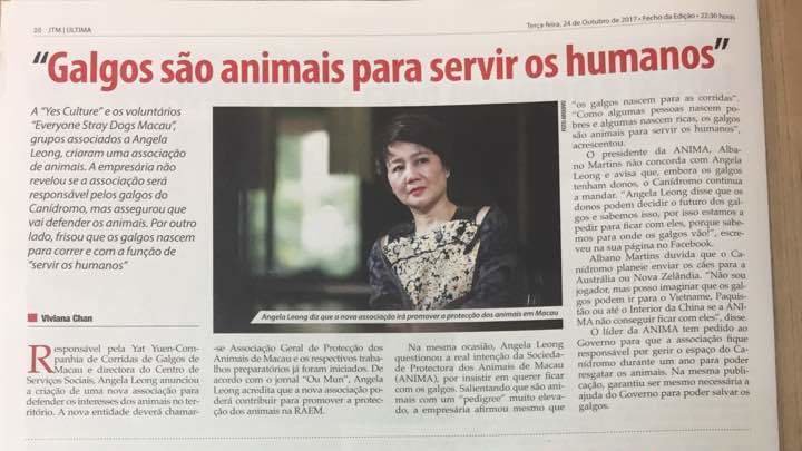 Petition updateSave Macau’s Image, Save GreyhoundsANGELA LEONG says: 'GREYHOUNDS ARE BORN TO RACE AND TO SERVE THE HUMANS'