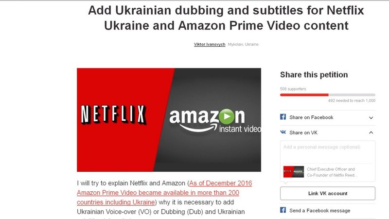 Mise à jour sur la pétitionAdd Ukrainian dubbing and subtitles for Netflix Ukraine and Amazon Prime Video content508 підписів!