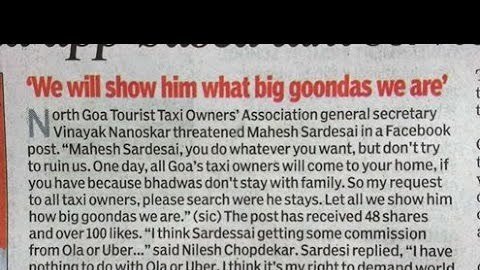 While we have received no response from our beloved Chief Minister Manoharbhai, there have been threats against Mahesh from the General Secretary of North Goa Tourist Taxi Owners Association Vinayak Nanoskar as per article published in Times of India - see url at end.