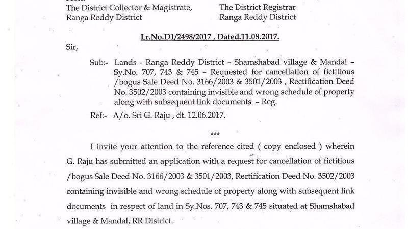 Обновление к петицииSHAMSHABAD LAND HIJACKING - REAL ESTATE FRAUDS - 71 NHRC DIRECTIONS TO TELANGANA GOVT.COLLECTOR DIRECTED FOR CANCELLATION BASED ON ENQUIRY