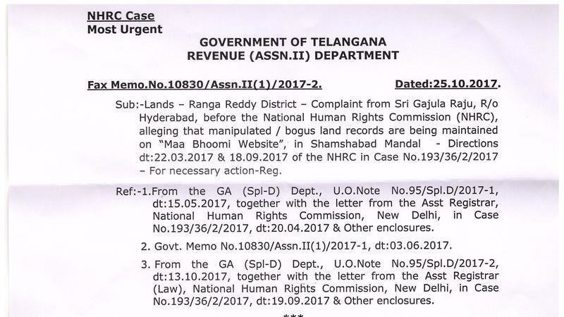Actualización de la peticiónSHAMSHABAD LAND HIJACKING - REAL ESTATE FRAUDS - 71 NHRC DIRECTIONS TO TELANGANA GOVT.GOVERNMENT OF TELANGANA ASKED DISTRICT COLLECTOR TO SUBMIT REPORT