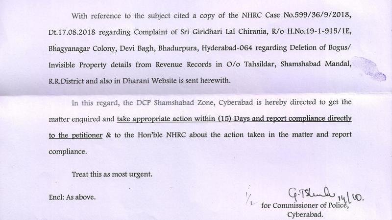 Petition updateSHAMSHABAD LAND HIJACKING - REAL ESTATE FRAUDS - 71 NHRC DIRECTIONS TO TELANGANA GOVT.NHRC passed order to Submit Action Taken Report to Police