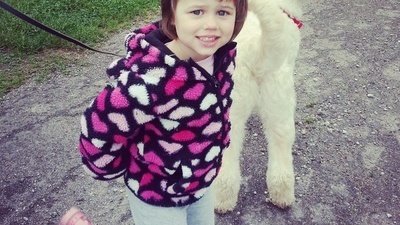 Addie has a host of medical problems, but you would never know by looking at her as it doesn't get her down. She has a rare lung disease and a brain malformation along with Autism. She has little to know impulse control and a seizure disorder and gets chronic lung infections. Three weeks ago we brought home a service dog for Addie -- a loving GoldenDoodle named Data. He has been a total lifesaver and he is AWESOME.