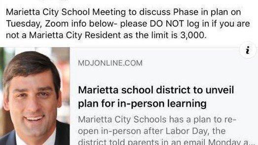 Attached is a headline from the MDJ yesterday announcing Marietta City Schools Superintendent has a plan to begin returning students back to the classroom after Labor Day. Marietta City Schools is within Cobb County; therefore, Cobb County Schools should be able to implement phase 1 of their plan for f2f beginning after Labor Day, as well. Lots of us are working many different angles to see to it that our children get to return to the classroom as quickly and normally as possible.