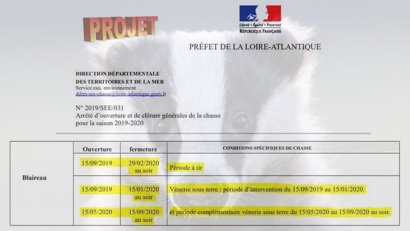 Parmi les mauvais élèves habituels, la Loire Atlantique s'illustre une nouvelle fois par des dispositions inappropriées relatives à l'espèce blaireau prises dans son projet d'arrêté. Ainsi, ce département prévoit d'autoriser une période de tir allant du 15 septembre 2019 au 29 février 2020 et une période complémentaire de vénerie sous terre allant du 15 mai 2020 au 15 septembre 2020, laquelle se prolongera jusqu'au 15 janvier de l'année suivante. Bien que que ces dates soient à chaque fois préalablement débattues entre les parties lors des commissions CDCFS, le calendrier reste invariablement le même d'une année à l'autre.