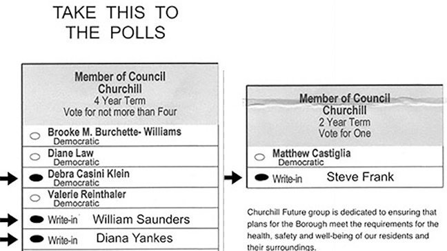 Churchill Future supports four candidates for the Borough of Churchill Council in the November 2 election. Attached is a sample ballot. It shows how we are asking you to vote if you oppose the Amazon Distribution Center in Churchill.