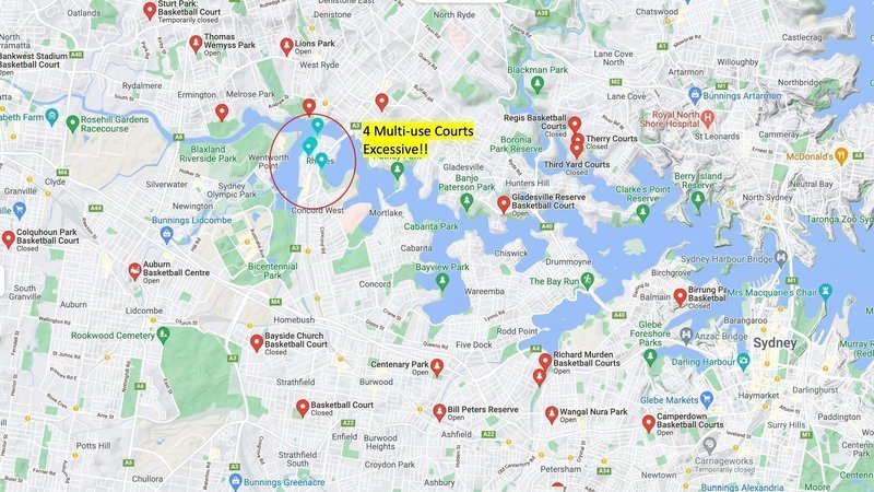 The council told us there are plans to have 4 multi-use courts in Rhodes (Canada Bay currently has 4):