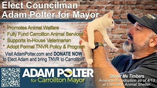However, this is just one step, and a petition alone is not enough. We need to take the next step and elect a Mayor and Council members that believe in TNR/TNVR and will do what it takes for Carrollton to formally adopt the policy and practices that support TNVR. We have a terrific opportunity right now. Councilman Adam Polter, who has four rescue cats of his own, and is an ardent supporter of TNVR and our rescue groups, is running for Carrollton Mayor. This is a prime opportunity to stand behind a candidate that stands with us and will make this change possible! Councilman Polter discusses this priority clearly on his campaign website at https://adampolter.com/animal-welfare/