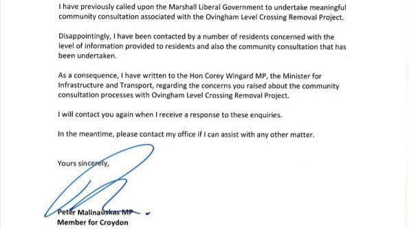 Minister Malinauskas has written to me explaining his office has previous called upon the Marshall Liberal Government to undertake meaningful community consultation associated with the Ovingham Level Crossing Removal Project.