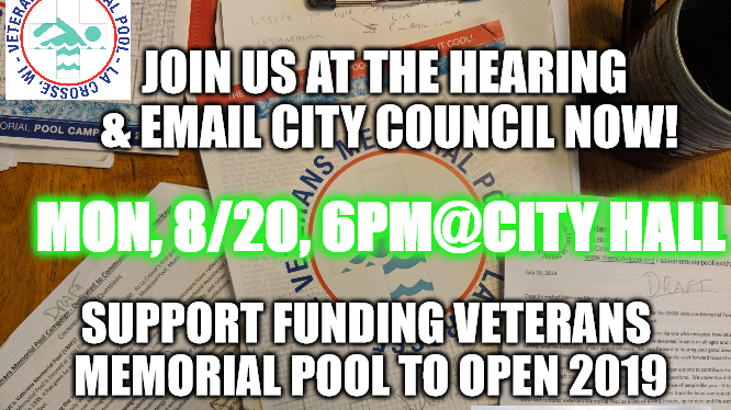 Thank you for over 3 years of support for the citywide Veterans Memorial Pool renovation effort. Veterans Memorial Pool is a rare opportunity to build community, improve health, honor our veterans & preserve our valuable heritage. It is an investment in city revitalization for some areas as well as prevention of decline for others. Like having quality roads, sewers, fire/police services, and parks, it makes living in La Crosse worthwhile. Please continue to move Veterans Memorial Pool forward by approving the new pool design and remaining funding to open the pool in 2019.