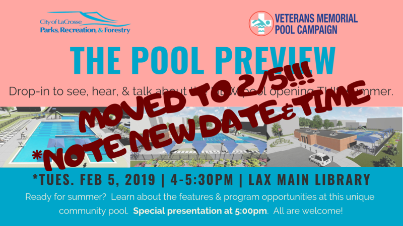 At 5:00pm a short presentation will cover the design features of the modernized facility as well as the unique programming opportunities for this community pool. Also, the progress of the community fundraising campaign will be announced and information about getting involved will be available to take home. Like the Veterans Memorial Pool, persons of all ages, abilities, and from all areas of La Crosse are welcome!