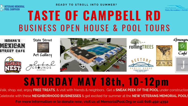 The City of La Crosse Parks, Recreation, and Forestry Department, in partnership with the Veterans Memorial Pool Campaign (VMPC) and nine neighborhood businesses, proudly presents: Taste of Campbell Rd – Business Open House and Pool Tours.
