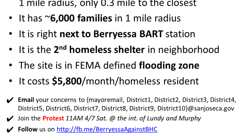 Petition updateSay NO! to the homeless shelter on VTA area along Mabury Road in Berryessa, San JoseAnti-BHC Protest Notice!! Join us on this Saturday