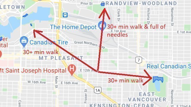 I've attached a pic of where my closest official off-leash areas are and where I'm excepted to go to let me dog play, despite not having a vehicle, as I know is the case for many of my dog owning friends.