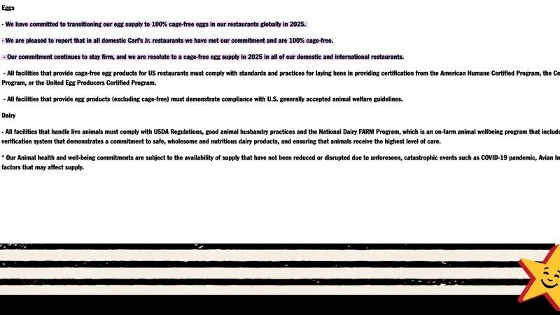 We have an exciting update to share with you all today: due to your hard work and relentless efforts, CKE is now reporting progress for Carl's Jr.'s US locations! 💥 CKE published the statement: "We are pleased to report that in all domestic Carl’s Jr. restaurants we have met our commitment and are 100% cage-free." The company also reaffirmed its commitment to go cage-free globally—this is huge!