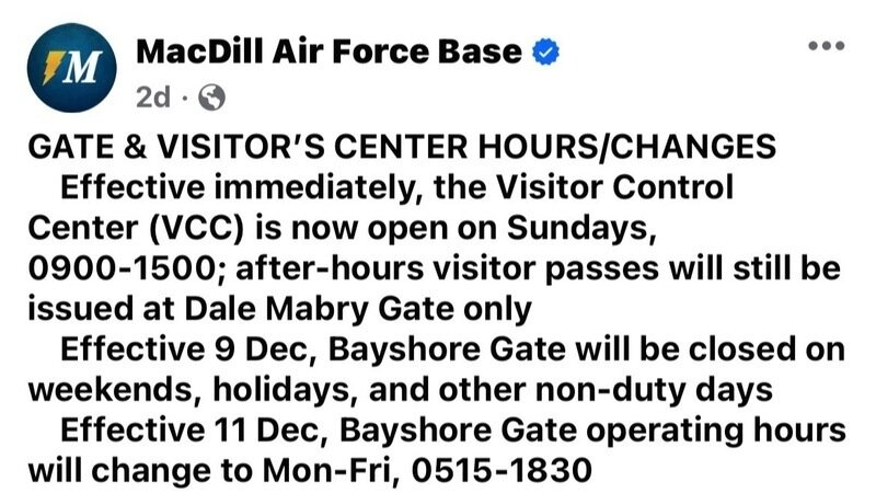 The MacDill Air Force Base made this update on their Facebook page: