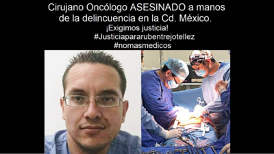 El pasado 8 de enero de 2019, el cirujano oncólogo Rubén Trejo Téllez de 36 años perdió la vida a manos de un asaltante en la colonia Nonoalco de la CDMX, cuando esperaba en la fila para cargar combustible en su vehículo. El cirujano había hecho una carrera de amplio impacto por el bienestar de miles de mexicanos con problemas de salud. Exigimos justicia y la aplicación de todo el peso de la ley por esta atrocidad.