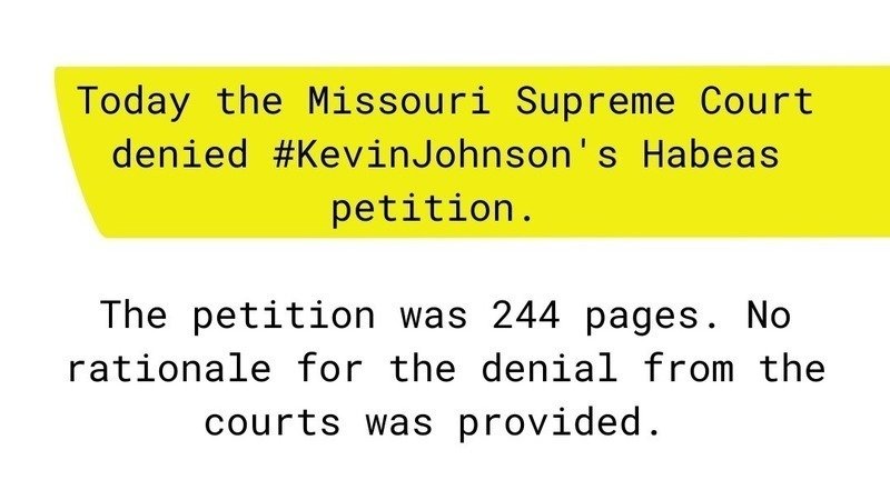 Today the Missouri Supreme Court denied #KevinJohnson's Habeas petition. The petition was 244 pages. No rationale for the denial was provided by the court.