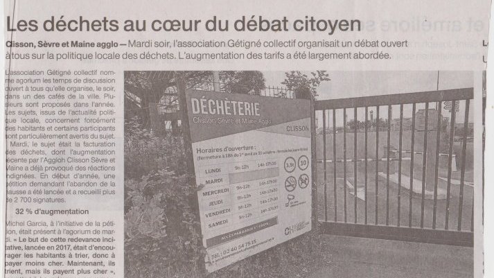 Article de Ouest France aujourd'hui sur "Getigné Collectif" , en particulier le débat qu'il y a eu mardi soir sur l'augmentation des tarifs de la facturation des déchets des habitants de l'agglo Sèvre et Maine.