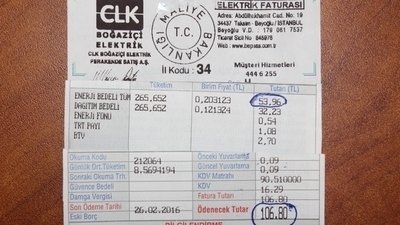 CLK Boğaziçi Elektrik faturalarında; tüketim bedeli dışındaki kalemler faturayı %100 katlamakta. Kendim şahsen tüketim bedeli 53.96 TL olan faturam, dağıtım bedeli, enerji fonu, TRT payı, BTV, KDV ile birlikte 106.80 TL olarak faturalandırılıyor.