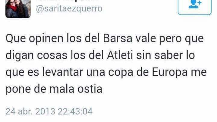 Solicitamos la expulsión de la jugadora saritaezquerro del atletico de madrid féminas(B) por su falta de respeto hacia nuestro club y toda su afición durante la celebración de la copa de europa ganada por el real madrid ante el atletico de madrid. Nadie dice ni exige que se deba de ser del atletico de madrid por jugar en el,pero si se le debe de guardar un respeto ya que detras de esa camiseta hay una larga historia y millones de aficionados a los cuales no se les puede faltar el respeto de esta manera teniendo en cuenta que es una jugadora que estan en nuestro club "para defender nuestros intereses"y también ganan dinero por ello,dinero que directa o indirectamente sale de toda la afición colchonera de una manera u otra. Por eso consideramos una falta de respeto y solicitamos la expulsión del club a esta jugadora que luce nuestra camiseta,con lo que ello conlleva,celebrendo el titulo que nos a ganado nuestro eterno rival como unas aficionada,y las multitudes faltas de respeto y menosprecio hacia el club atlético de Madrid s.a.d,club que la dá la oportunidad de formarse como futbolista, sin tener en cuenta que se nos falta el respeto a miles de aficionados
