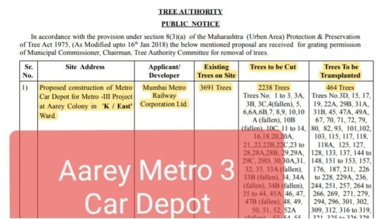 The Mumbai Tree Authority has issued their notice for the cutting/ removal of 2702 trees for the Metro3 Car Depot for which it is inviting suggestions and objections.