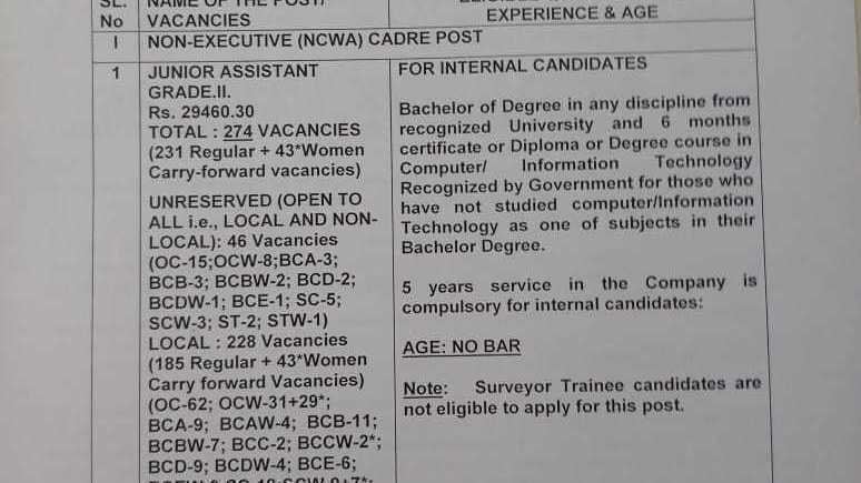 In the recent notification for junior assistant (internal) the eligibility criteria was degree with computer certificate and 5 years of service in the Sccl company. But the same criteria was not applicable for all the internal exams. In the recent notification for the welfare officers and the MAnagement trainee (mining) the service criteria was nil and 3 years respectively. Is this the equal justice to all the workmen in the company. As the company TAGLINE says one family one vision one mission. Please support us to get wavier for the service criteria for the post of junior assistant (internal)
