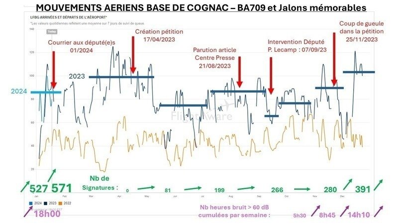 La dégradation de la situation continue en janvier 2024 (chiffres provisoires) et nous avons dépassé les 3 heures cumulées par jour de nuisances sonores pour les zones les plus touchées par le survol des Pilatus PC-21.