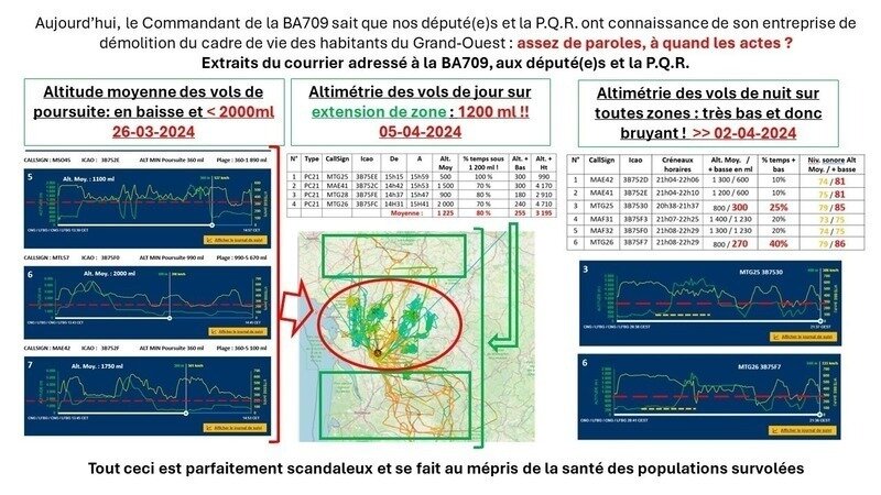 Puis, face à la dégradation des conditions de vols des Pilatus PC21 (altitude moyenne de vol, vol de nuit, utilisation de la zone étendue), nous avons réécrit le 09/04/2024 un courrier aux députés + PQR intitulé « 3 SCANDALES SUR LES ACTIVITES DU COMMANDEMENT DE LA BASE AERIENNE DE COGNAC – BA709 » ainsi qu’un autre courrier le 20/04/2024 au Commandant de la BA709 + copies députés et PQR pour s’assurer que le commandement de la BA709 sache que les représentants de la nation + PQR étaient aussi au courant de leur mystification :