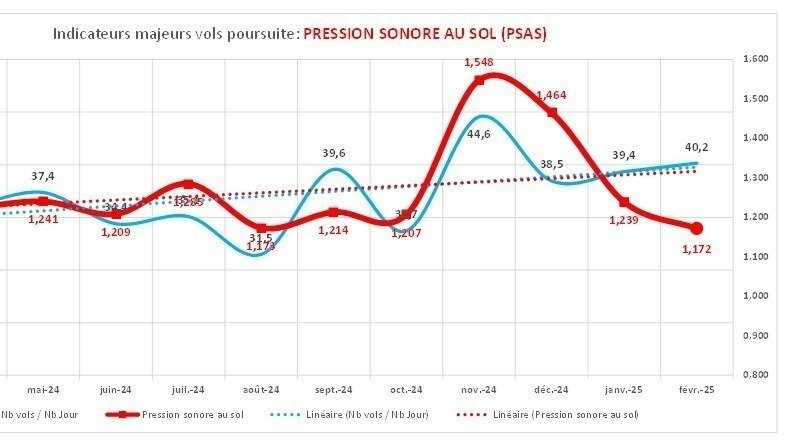 Niveau de pollution sonore = le plus bas jamais enregistré depuis le début du suivi du PSAS (mars 2024)