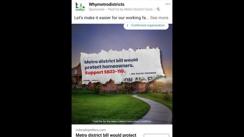 The developer and metro district industry lobby group MDEC is buying advertising on facebook to legalize metro district abuse. They are also promoting their legislative sponsor Sen. Zenzinger, who sponsored a very similar bill for them two years ago.
