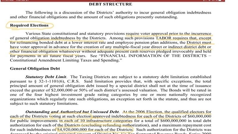 The excerpt above from the bond prospectus says I voted to authorize $4.9 billion in debt on me and my neighbors. I didn't and didn't even know this existed. I didn't know that the developer and 7 of his relatives and employees sat around a table eating pizza and "voted" to impose $4.9 billion in authorized debt on me. And voted to take away my right to vote on tax and bond debt. That is part of my story.