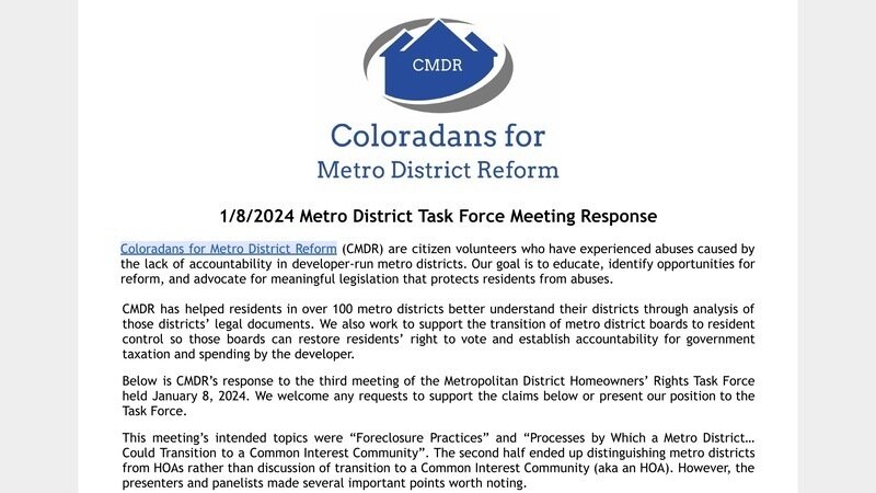 The legislative Task Force addressed the interaction between HOAs and Metro Districts. The first speaker confirmed what the Bond Prospectus' make clear - the residents' homes are at risk of foreclosure for failing to pay developer debt, assuming the debt is based upon enforceable agreements.