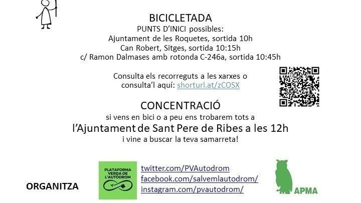 Os adjunto el cartel de la convocatoria y como podréis ver, tenéis la opción de participar en el recorrido en bicicleta o uniros directamente en el punto de encuentro frente al Ayuntamiento de Sant Pere de Ribes.