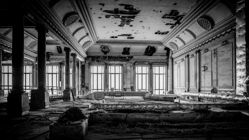 Aux abords du théâtre des volumes majestueux, privés de la présence d'un public depuis plus de trente ans.