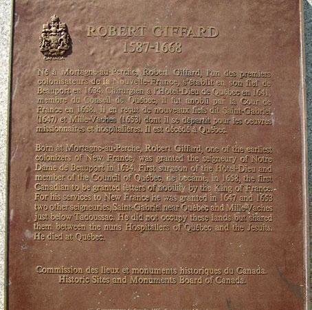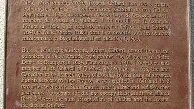 Robert Giffard est étroitement associé à un des premiers mouvements d'émigration française en Nouvelle-France et a, de ce fait, contribué largement au peuplement du Canada-français. Il est le fondateur de l'ancienne ville de Beauport, maintenant fusionnée à la ville de Québec. Giffard a été le premier médecin de l'Hôtel-Dieu de Québec. Cette plaque a été dérobée il y plusieurs années.