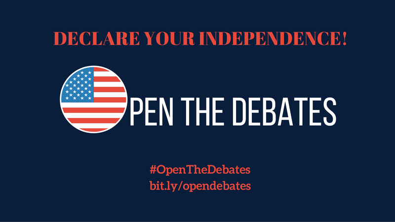 We are not calling for the overthrow of our government. We are demanding a simple, elegant reform that we believe will have a large impact on the voices and choices of U.S. voters in our electoral process. We call on each of you to declare your independence from the Democrats and Republicans and share our petition to #OpenTheDebates to all ballot-qualified candidates.