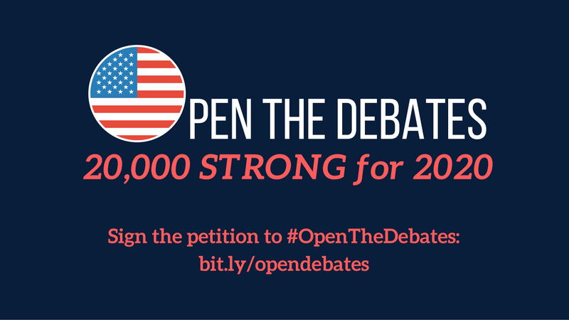 Share this update far and wide and we will smash through 20,000 and reach closer to our goal of 25k. Post the update to social media with the hashtag #OpenTheDebates and the link bit.ly/opendebates. Forward it to your friends and family. Write a letter to the editor of your local paper about the need to open the debates to more voices and more choices. Mention that 76% of voters in 2016 wanted them open to the leading third party candidates from the Libertarian Party and Green Party.