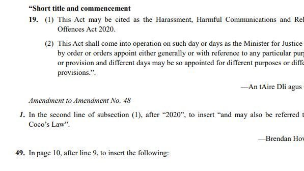 We are delighted to see that CoCo`s law will pass into the committee stage tomorrow, 1st December 2020, and that the bill is going to be named after CoCo along with the formal title The Harassment, Harmful Communications and Related Offenses Act 2020.