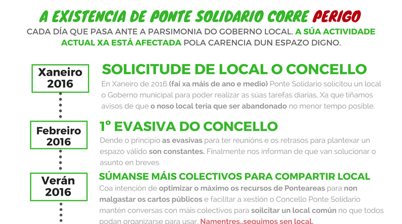 En Xaneiro de 2016 Ponte Solidario solicitou un local ó Goberno municipal para poder realizar as súas tarefas diarias. En verán sumaríanse outros colectivos co fin de compartir local e optimizar os recursos públicos. Dende o principio as evasivas para ter reunións e os retrasos para plantexar un espazo válido foron constantes. En Febreiro de 2016 informóusenos que o asunto estaba avanzado pero non é hasta Setembro que o Concello, a suxerencia da organización solidaria, ofrece un espazo na Estación de Autobuses.
