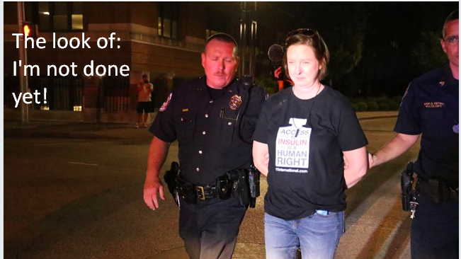Nicole Smith-Holt, arrested on Sept. 14, 2019, at the Eli Lilly company in Indianapolis, IN. She did it willingly to show her strength and to send a message that the next people to have handcuffs on are the pharmaceutical executives that are responsible for the list prices of insulin and continue to price gouge us because there are no laws against what they're doing. There is collusion, there are monopolies, there is greed, there is injustice, there are people dying and these people get away with murder. She was issued a citation and released.