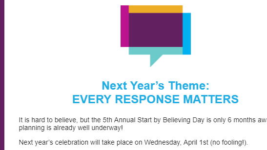Then stay tuned! We will keep you posted on our plans for the 5th annual Start by Believing Day, and share some of the invaluable stories we receive.