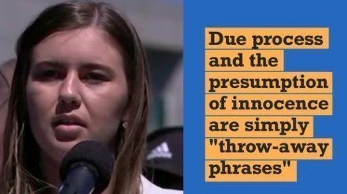 But now, the Due Process Deniers have become emboldened by their successes. So at a recent rally in Australia, Brittany Higgins -- pictured above -- announced that due process and the presumption of innocence are simply "throw-away phrases."
