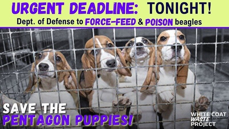 We’re fighting to save a batch of baby beagles—the “Pentagon Puppies”—who could suffer and die in a lab funded by the Dept. of Defense (DOD). In these kinds of tests, a beagle’s mouth is stuffed with chemicals—and then TAPED SHUT so she can’t regurgitate the poison.
