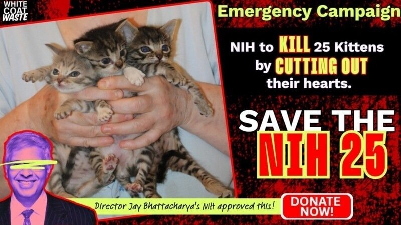 48-Hour Rapid Response Deadline: Follow this secure link to rush $2.50 (only a dime per kitten!) to help stop NIH from cutting out the hearts of 25 kittens—and your gift will be MATCHED to save even more animals!