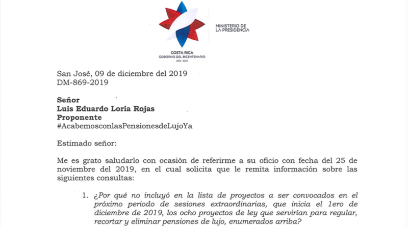 El 25 de noviembre pasado, enviamos una carta al Sr. Presidente de la República, don Carlos Alvarado Quesada, con tres preguntas concretas relacionadas con la eliminación de #PensionesDeLujo, que son de interés de todos los costarricenses: