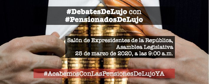 Para este importante evento, hemos invitado a 3 #PensionadosDeLujo del Magisterio Nacional, 3 #PensionadosDeLujo del Poder Judicial, 3 #PensionadosDeLujo Exdiputados y 3 #PensionadosDeLujo Expresidentes de la República a debatir acerca de la justicia y moralidad de estos privilegios que les permiten vivir como sanguijuelas de la sociedad, con lujos millonarios pagados por el pueblo costarricense.