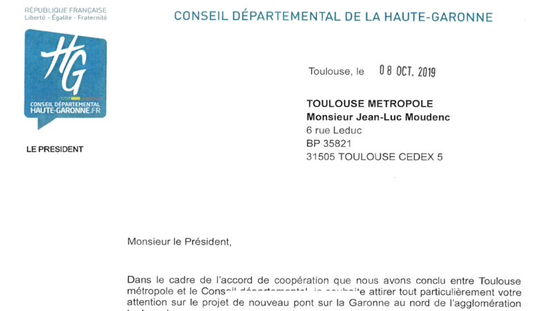 Monsieur Méric a adressé le 8 octobre un courrier (voir lien ci-après) à l'attention de Monsieur Moudenc président de Toulouse Métropole pour réaffirmer "la pertinence d'un pont de franchissement sur la Garonne au nord de Saint-Jory" et se désolidariser des nouvelles études engagées par la Métropole comme indiqué par M. Carneiro via la DDM le 27 août dernier .